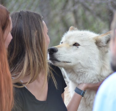 For many years, co-founders Kent Weber and Tracy Ane Brooks traveled with wolves across the country on a bus-tour of educational programs. These days, they welcome visitors from all over the world to learn about wolves on-site and volunteer for the sanctuary.